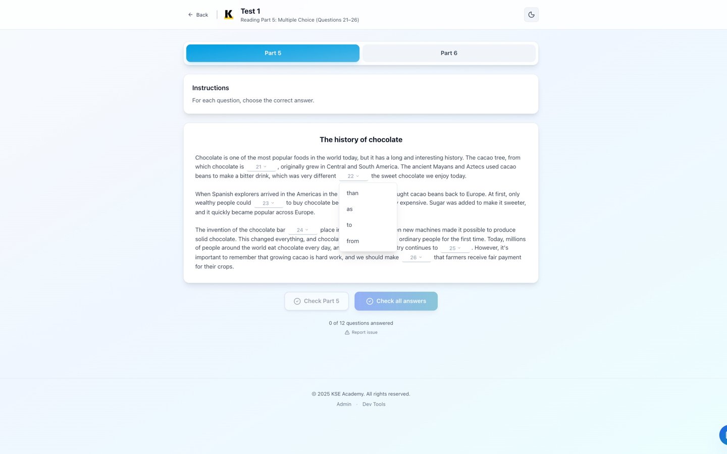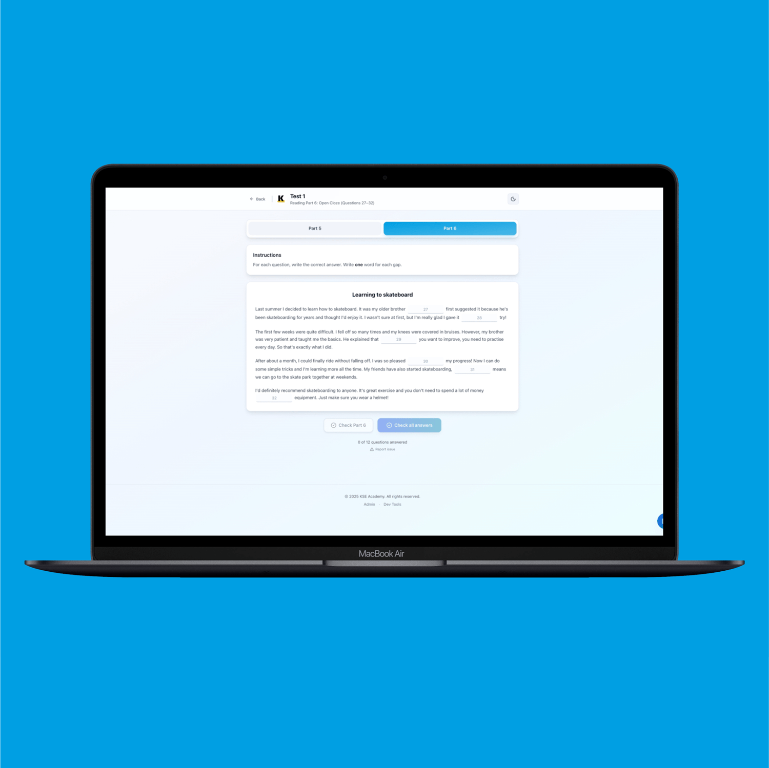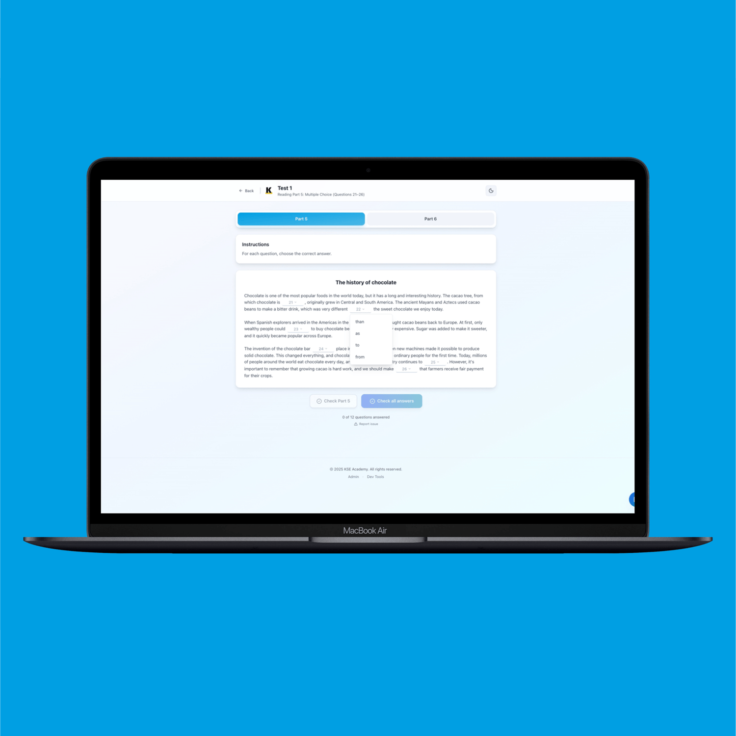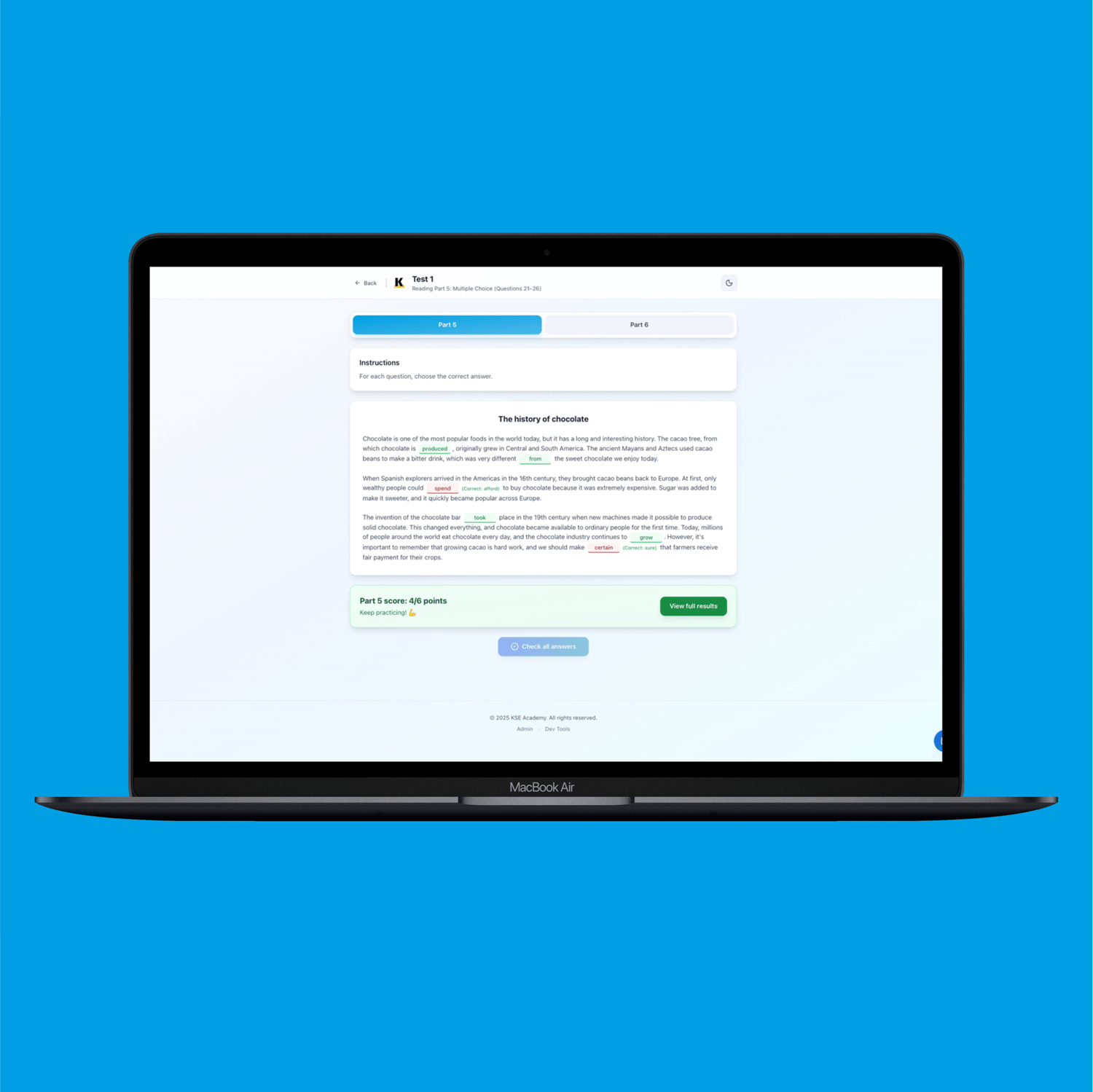 Preparing for the B1 Preliminary exam? Our online practice platform offers everything you need to master Reading Parts 5 and 6 with 10 exam-style tests that closely replicate the real experience—only better. Enjoy these digital practice materials with instant automatic scoring and feedback, detailed PDF performance reports, and a user-friendly interface accessible on any device. With built-in note-taking tools and a strong commitment to your privacy, you get lifetime access with a one-time payment and no hidden fees. Plus, try our free score calculator to track your progress or assist teaching. Start boosting your B1 Preliminary score today with immediate access and practice on your own terms!