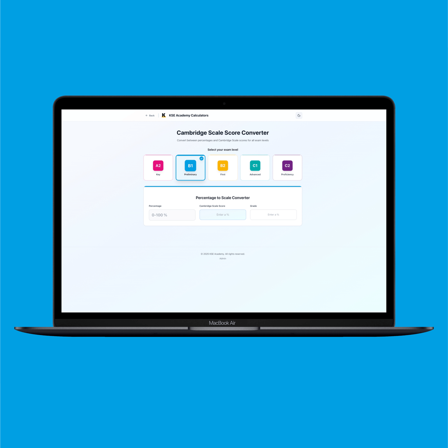 Even if you're not ready to purchase, try our free online score calculator for Cambridge English exams (A2 Key through C2 Proficiency). Perfect for tracking your progress across practice tests or for teachers generating student reports. Export your results with just one click.