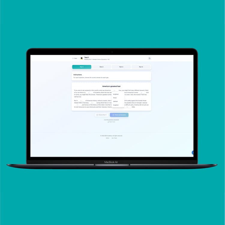 Part 1 consists of a short text with eight gaps in it (plus one gap as an example). Each gap represents a word or phrase that is missing. The text is then followed by eight groups of four words or phrases (A, B, C or D), each of which corresponds to a gap. Candidates must select which of the four words or sentences in the set correctly fills the gap.